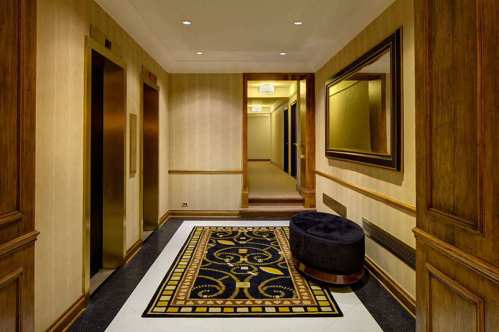 The lap of luxury is what this seating reads. Strategically situated directly in front of the concierge station, visitors to this Sutton Place building feel as if they’re entering a sumptuous living room. The owners wanted opulence — and opulence is precisely what they got!