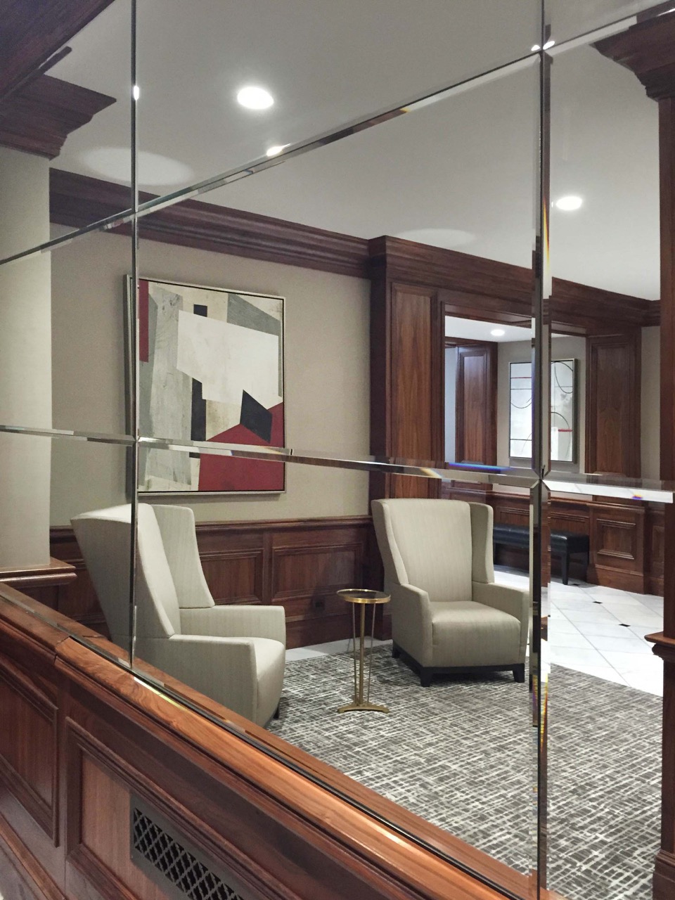 The wing chairs we selected for this classic lobby on the Upper East Side impart a sense of privacy in this busy lobby. Their “architectural” profile keeps them from looking like wing chairs in stuffy men’s clubs.