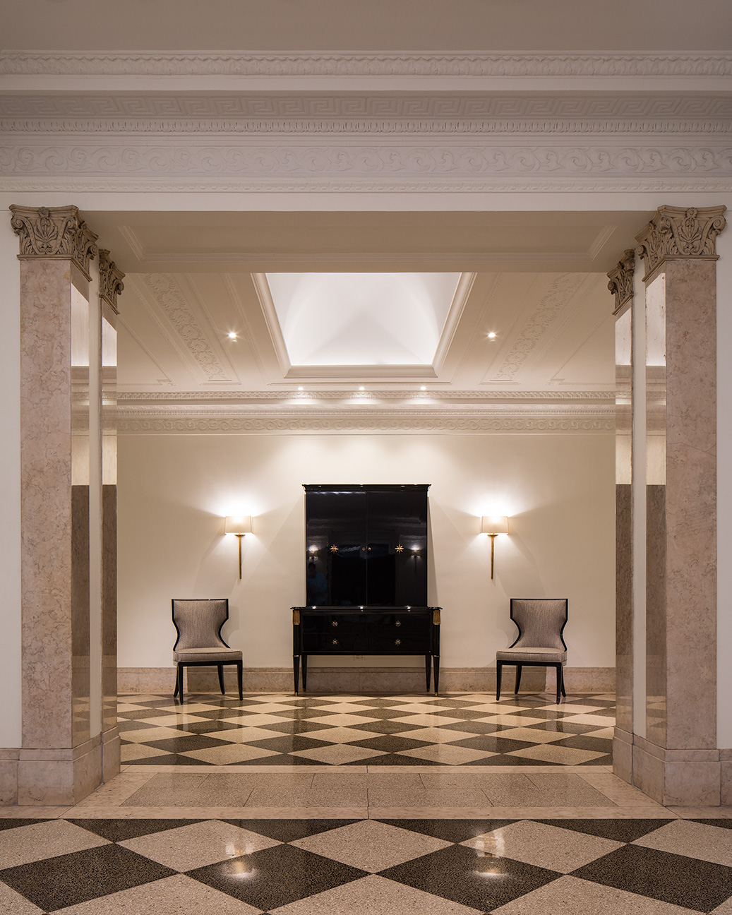 A bench is always a practical choice for lobby seating, but for this spectacular 1929 lobby, we didn’t choose just any bench. Notice the splayed arms, roll cushions, and adeptly-matched striped fabric. It’s drop dead gorg!