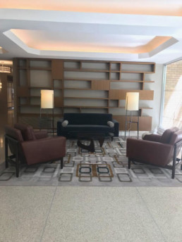 Color can be played with for the lobby furniture and accessories. Sometimes clients request very strong colors, but we’re careful to choose versions of those colors that are not jarring or produce anxiety. One of our recently completed lobby re-dos in Greenwich Village is a perfect example: