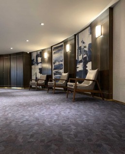 For this Upper East Side lobby, our challenge was to add a sense of modernity to the lobby area yet to re-use the existing paneling and hard-surface flooring. We anchored the space, we selected this dark navy blue, black, and gray carpet. The navy element gives the entire pace a fresh look, partly because navy is so new in interior design. Yet, when combined with grey and black, provides a timeless flooring solution.