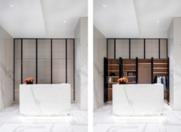 I like to say, “Storage is something that should not be seen or heard.” So, at every opportunity, we hide or camouflage anything that even looks like a closet door. Wood wall paneling and with secret doors that conceal dry-cleaning closets, package rooms, and storage rooms are already a hallmark of our lobby interior design work. Zen design fits right into our creative sensibilities.