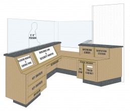 - An innovative flush groove-and-track system that’s sunk into the periphery of the desktop. It will hold a clear plexiglass protection screen that separates the doorman from residents, visitors, delivery people, contractors, and anyone who needs to converse with him. It has a slot for paperwork, shipping envelopes, etc.