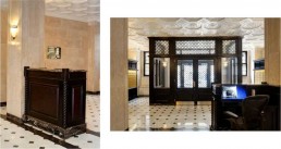 My team and I painstakingly considered every inch of this lobby, from ceiling to floor. The concierge desk design was inspired by one of the original pieces of lobby furniture – a console table with carved turning legs. The new desk has all the technology needed to run a modern building, yet perfectly complements the incredible architectural details of the lobby.