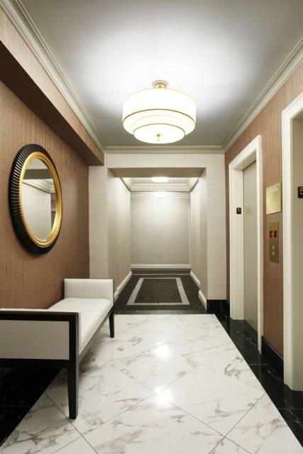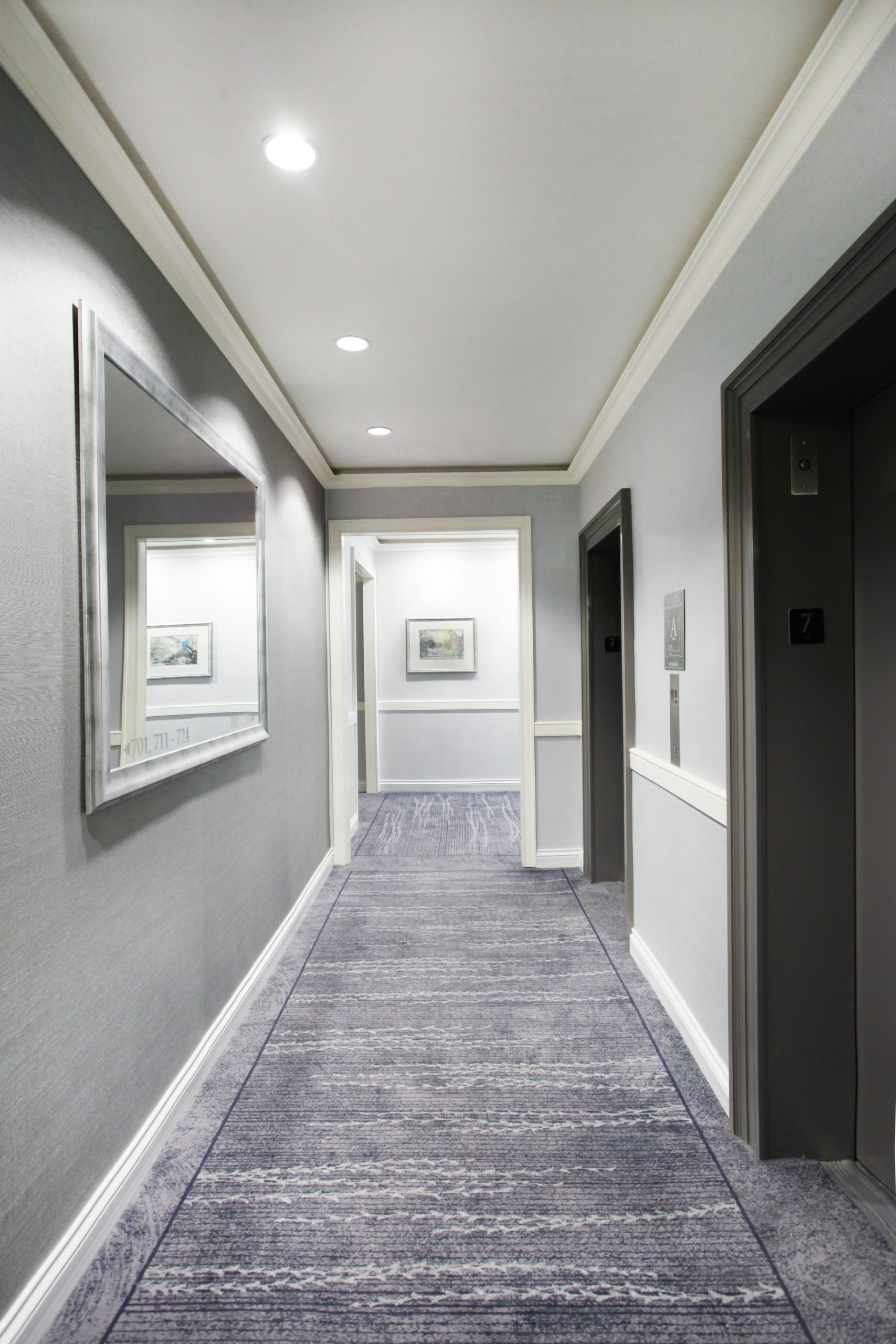 There’s nothing wrong with going a bit bold at the elevator landing. There, we like to use a darker accent color wall covering. Why? It forces those walls to recede, making the hallways wider.