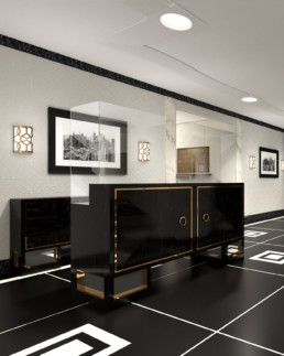 All lobby design schemes that come out of our office include custom doorman desks that double as sanitation stations. These desks contain space for all the necessary equipment that door staff needs at their fingertips in order to keep their area germ free. And keeps all of it out of sight to reduce clutter.